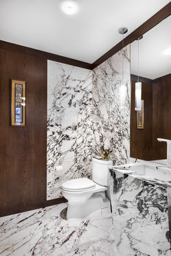 A floor to ceiling, wall to wall built-in cabinetry unit was constructed adjacent to the dining area to serve as both a bar area as well as side board for dining. The rich walnut and natural stone used provides a rich, warm backdrop for the natural walnut dining table. Sleek floor to ceiling sliding glass doors were installed in the large living room to create a separate media room for music and television activities with acoustical privacy. A beautiful, custom designed desk was fabricated for the Master Bedroom using leftover from the slab in the Dining Area.
