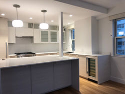 Stunning views down Sixth Avenue in New York City are a key feature of this two bedroom coop apartment in a modern white-brick building built in the 1950s. The views are a fitting backdrop to the "minimal yet warm" aesthetic sought by the client couple and their young son. The original formal apartment layout was reconfigured to allow for open living, dining and kitchen living.